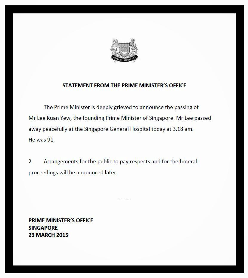 Image Lee Kuan Yew, founder of modern Singapore, dies at 91 #LeeKuanYew 23 Monday Mar 2015 Posted by The Template News, Current Affairs and Sport Website in Asia π, China π¨π³, Financial π· π² π¦, International News ≈ Leave a comment TagsLee Kuan Yew, Singapore Lee Kuan Yew, 1923 – 2015 Share this: Click to share on Facebook (Opens in new window) Facebook Click to share on LinkedIn (Opens in new window) LinkedIn Click to share on X (Opens in new window) X Click to share on Tumblr (Opens in new window) Tumblr Like Loading... Related