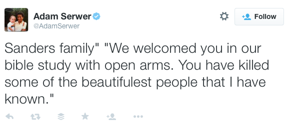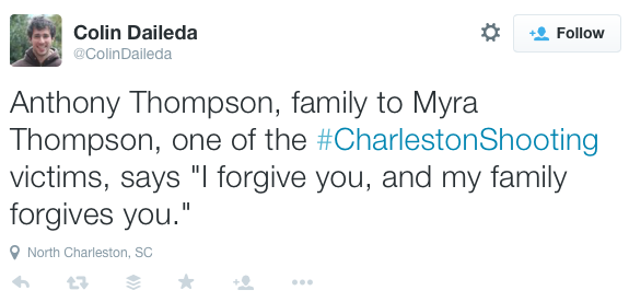 Image Families ‘forgive’ suspected Charleston Church shooter #CharlestonChurchShooting #Carolina 19 Friday Jun 2015 Posted by The Template News, Current Affairs and Sport Website in Comment, International News, USA πΊπΈ ≈ Leave a comment TagsCharleston Church Shooting, Far Right, GUN crime, USA πΊπΈ, White Supremacist Share this: Click to share on Facebook (Opens in new window) Facebook Click to share on LinkedIn (Opens in new window) LinkedIn Click to share on X (Opens in new window) X Click to share on Tumblr (Opens in new window) Tumblr Like Loading... Related