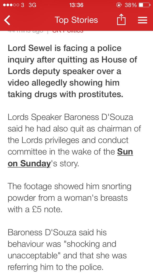 Image LABOUR PEER RESIGNS AFTER TABLOID STING #TheSun 26 Sunday Jul 2015 Posted by The Template News, Current Affairs and Sport Website in Politics πΌ π³ πͺ ≈ Leave a comment TagsDrugs, Labour, Labour Peer resigns, UK LORD SEWEL RESIGNED FROM HIS POSITION AS HOUSE OF LORDS DEPUTY SPEAKER AND NOW FACES A POLICE INQUIRY INTO NEWSPAPER ALLEGATIONS HE TOOK DRUGS WITH PROSTITUTES Share this: Click to share on Facebook (Opens in new window) Facebook Click to share on LinkedIn (Opens in new window) LinkedIn Click to share on X (Opens in new window) X Click to share on Tumblr (Opens in new window) Tumblr Like Loading... Related