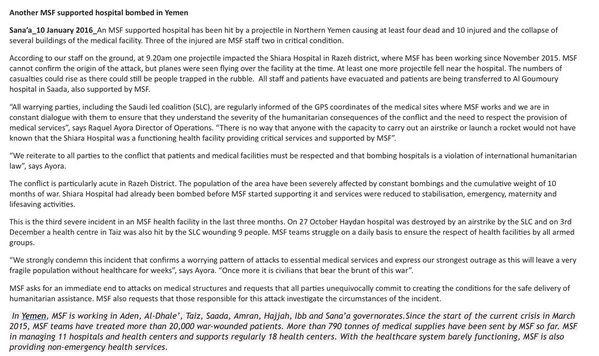 Image THREE KILLED AFTER ‘PROJECTILE’ HIT MSF HOSPITAL IN NORTHERN YEMEN #Yemen #MedecensSansFrontieres #MSF #NayabChohan #TemplateNews 10 Sunday Jan 2016 Posted by The Template News, Current Affairs and Sport Website in Arab World π, Crime πͺ π«, International News, Politics πΌ π³ πͺ, Terrorism, USA πΊπΈ ≈ Leave a comment TagsMSF, MSF HOSPITAL strike, Saudi Arabia, Yemen, Yemen Conflict Share this: Click to share on Facebook (Opens in new window) Facebook Click to share on LinkedIn (Opens in new window) LinkedIn Click to share on X (Opens in new window) X Click to share on Tumblr (Opens in new window) Tumblr Like Loading... Related