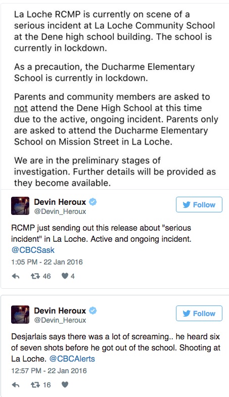 Image FOUR KILLED IN CANADA SCHOOL SHOOTING 23 Saturday Jan 2016 Posted by The Template News, Current Affairs and Sport Website in Children, Crime πͺ π«, International News, USA πΊπΈ ≈ Leave a comment TagsGUN crime, Saskatchewan shooting SASKATCHEWAN – Acting Mayor’s daughter one of the dead. ‘Shooter’ has been arrested. Share this: Click to share on Facebook (Opens in new window) Facebook Click to share on LinkedIn (Opens in new window) LinkedIn Click to share on X (Opens in new window) X Click to share on Tumblr (Opens in new window) Tumblr Like Loading... Related