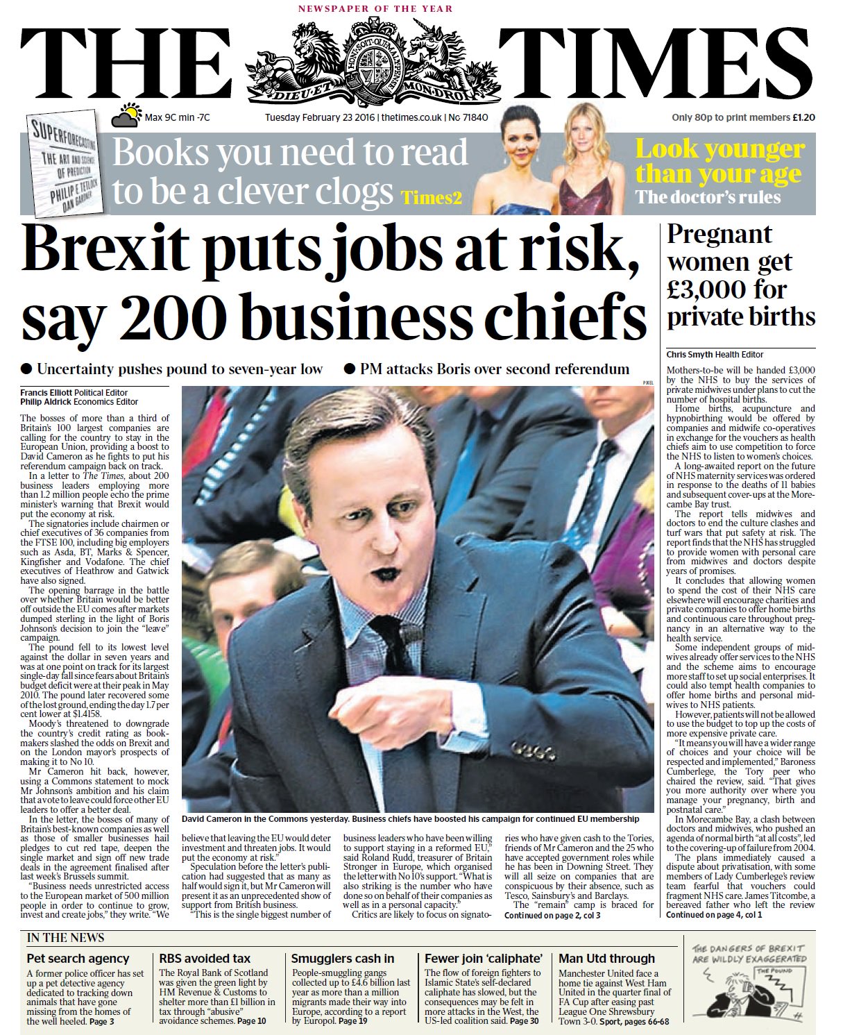 Image BREXIT THREATENS BRITISH JOBS – BUSINESS CHIEFS πͺπΊ 23 Tuesday Feb 2016 Posted by The Template News, Current Affairs and Sport Website in Analysis π, Comment, Europe πͺπΊ, Financial π· π² π¦, France, Germany π©πͺ, International News, Politics πΌ π³ πͺ, UK ≈ Leave a comment TagsBrexit, UK Share this: Click to share on Facebook (Opens in new window) Facebook Click to share on LinkedIn (Opens in new window) LinkedIn Click to share on X (Opens in new window) X Click to share on Tumblr (Opens in new window) Tumblr Like Loading... Related
