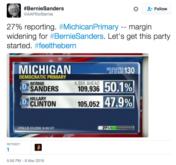 Image π³ SANDERS WINS MICHIGAN #SuperTuesday #Michigan #Mississippi #BernieSanders #HillaryClinton πΊπΈ 09 Wednesday Mar 2016 Posted by The Template News, Current Affairs and Sport Website in Analysis π, International News, Politics πΌ π³ πͺ, Race Relations, Social Affairs, Social Media, USA πΊπΈ, Women ≈ Leave a comment TagsSuper Tuesday SANDERS 50% CLINTON 48% Share this: Click to share on Facebook (Opens in new window) Facebook Click to share on LinkedIn (Opens in new window) LinkedIn Click to share on X (Opens in new window) X Click to share on Tumblr (Opens in new window) Tumblr Like Loading... Related