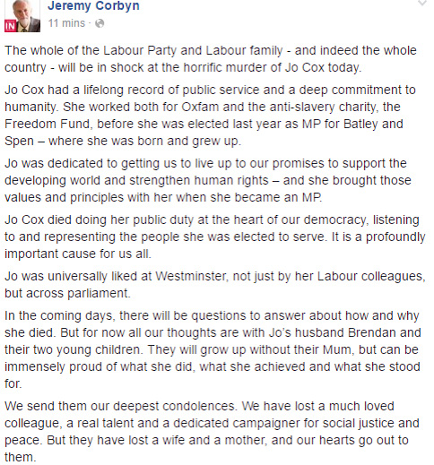 Image π BRITISH MP DIES AFTER BEING SHOT AND STABBED #JoCox π¬π§ 16 Thursday Jun 2016 Posted by The Template News, Current Affairs and Sport Website in Breaking News πΊ ππ, Crime πͺ π«, Politics πΌ π³ πͺ, UK ≈ Leave a comment TagsBrexit, Crime πͺ π«, Jeremy Corbyn, JeremyCorbyn, Jo Cox, Nayab Chohan, NayabChohan, NayabChohanLIVE, Politics πΌ π³ πͺ, Template News, Terrorism, UK Share this: Click to share on Facebook (Opens in new window) Facebook Click to share on LinkedIn (Opens in new window) LinkedIn Click to share on X (Opens in new window) X Click to share on Tumblr (Opens in new window) Tumblr Like Loading... Related