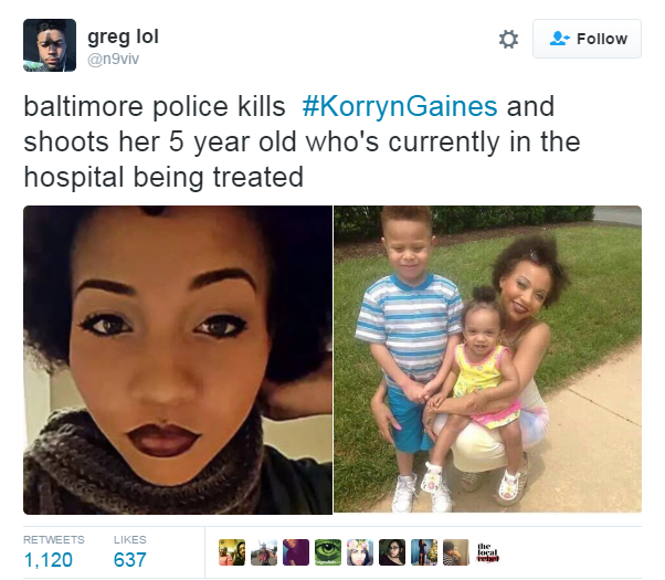 Image π BALTIMORE POLICE SHOOT THIS FIVE-YEAR AND KILL HIS MUM #KorrynGaines #Baltimore πΊπΈ 02 Tuesday Aug 2016 Posted by The Template News, Current Affairs and Sport Website in Children, Crime πͺ π«, International News, Politics πΌ π³ πͺ, Race Relations, Social Affairs, Social Media, USA πΊπΈ, Women ≈ Leave a comment TagsBlack Lives Matter, Distant Echoes, GUN crime, Korryn Gaines, Nayab Chohan, NayabChohan, NayabChohanLIVE, Politics πΌ π³ πͺ, Race Relations, Template News, USA πΊπΈ 39.290385 -76.612189 Share this: Click to share on Facebook (Opens in new window) Facebook Click to share on LinkedIn (Opens in new window) LinkedIn Click to share on X (Opens in new window) X Click to share on Tumblr (Opens in new window) Tumblr Like Loading... Related