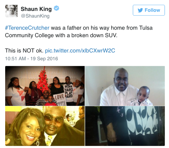 Image π¨ VIDEO OF UNARMED MAN SHOT DEAD BY TULSA POLICE #TerenceCrutcher #TulsaPolice #Oklahoma #BLackLivesMatter πΊπΈ 20 Tuesday Sep 2016 Posted by The Template News, Current Affairs and Sport Website in Crime πͺ π«, International News, Politics πΌ π³ πͺ, Race Relations, Social Affairs, Social Media, USA πΊπΈ ≈ Leave a comment TagsBlack Lives Matter, Terence Crutcher 35.007752 -97.092877 Share this: Click to share on Facebook (Opens in new window) Facebook Click to share on LinkedIn (Opens in new window) LinkedIn Click to share on X (Opens in new window) X Click to share on Tumblr (Opens in new window) Tumblr Like Loading... Related