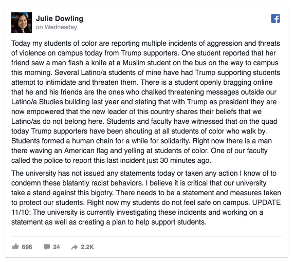 Image HATE ATTACKS AFTER TRUMP’S ELECTION πΊπΈ 12 Saturday Nov 2016 Posted by The Template News, Current Affairs and Sport Website in Arab World π, Crime πͺ π«, International News, Politics πΌ π³ πͺ, Race Relations, Social Affairs, USA πΊπΈ ≈ Leave a comment TagsDonald TRUMP 40.712784 -74.005941 Share this: Click to share on Facebook (Opens in new window) Facebook Click to share on LinkedIn (Opens in new window) LinkedIn Click to share on X (Opens in new window) X Click to share on Tumblr (Opens in new window) Tumblr Like Loading... Related