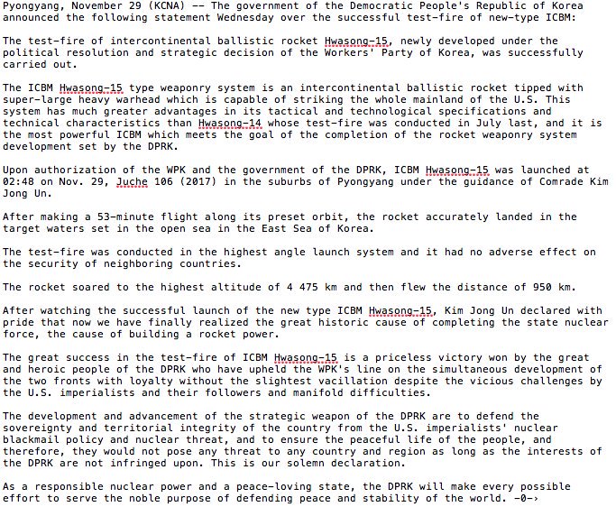#NorthKorea HAS FIRED NEW INTERCONTINENTAL BALLISTIC MISSILE ‘CAPABLE OF STRIKING ENTIRE US MAINLAND’ 29 Wednesday Nov 2017 Original size at 683 × 572 ≈ Leave a comment