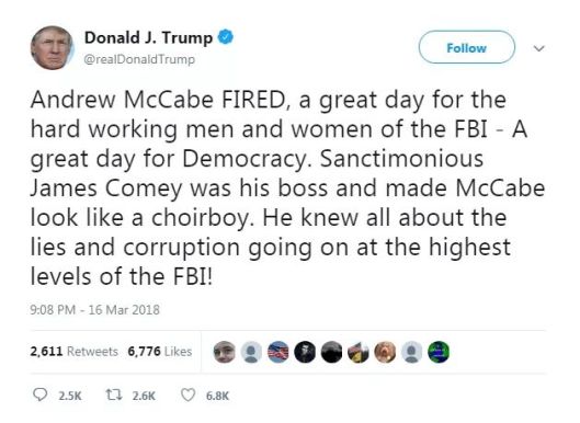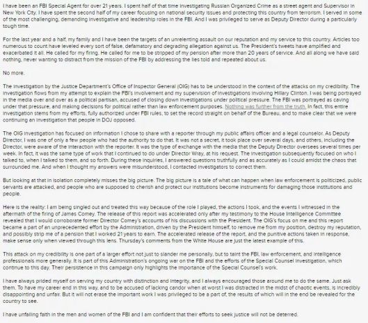 LATEST .. PRESIDENT TRUMP’S NEW APPOINTMENTS WERE FOLLOWED BY THE FIRING OF FBI DEPUTY DIRECTOR ANDREW MCCABE AFTER AN INTERNAL DEPARTMENT OF JUSTICE REPORT FOUND HE’D LEAKED INFORMATION AND LIED ABOUT IT .. HERE’S HIS RESPONSE ..