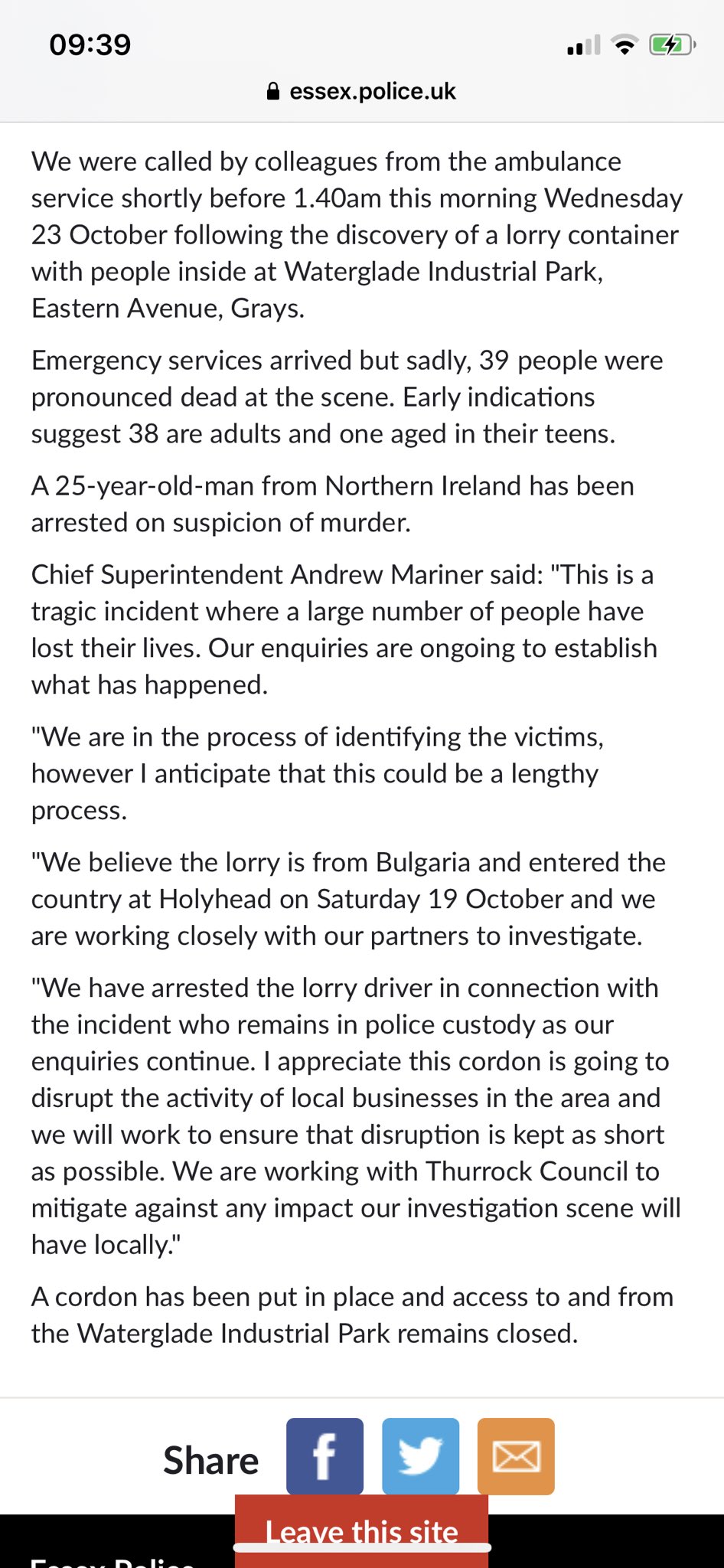 Image TEN TEENAGERS – TWO 15-YEAR-OLD BOYS – WERE AMONG 39 PEOPLE FOUND DEAD IN LORRY CONTAINER AT #Grays – #Essex POLICE REVEAL AS THEY RELEASE NAMES #NayabChohan #TemplateNews #DistantEchoes #NayabChohanLive nayabchohan.com gnayabchohan.com 08 Friday Nov 2019 Posted by The Template News, Current Affairs and Sport Website in Asia π, Children, International News, Social Affairs, UK ≈ Leave a comment TagsDEATHS, Distant Echoes, Essex, Grays, LORRY, LORRY Deaths, Migrants, Nayab Chohan, NayabChohanLIVE, Template News, Vietnam Share this: Click to share on Facebook (Opens in new window) Facebook Click to share on LinkedIn (Opens in new window) LinkedIn Click to share on X (Opens in new window) X Click to share on Tumblr (Opens in new window) Tumblr Like Loading... Related