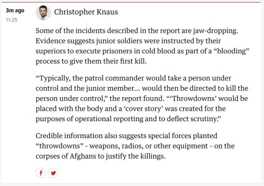 Image π¦πΊ SPECIAL FORCES ‘COMMITTED 39 UNLAWFUL MURDERS’ IN π¦π« – MILITARY REPORT INTO WAR CRIMES #NayabChohan #TemplateNews #DistantEchoes #NayabChohanLIVE nayabchohan.com gnayabchohan.com 19 Thursday Nov 2020 Posted by The Template News, Current Affairs and Sport Website in Asia π, Breaking News πΊ ππ, Children, Crime πͺ π«, International News, Politics πΌ π³ πͺ, Terrorism, UK, USA πΊπΈ ≈ Leave a comment TagsAfghanistan, Afghanistan π¦π«, Australia, Australia π¦πΊ, Child, Children, Distant Echoes, Template News, War Crimes Share this: Click to share on Facebook (Opens in new window) Facebook Click to share on LinkedIn (Opens in new window) LinkedIn Click to share on X (Opens in new window) X Click to share on Tumblr (Opens in new window) Tumblr Like Loading... Related