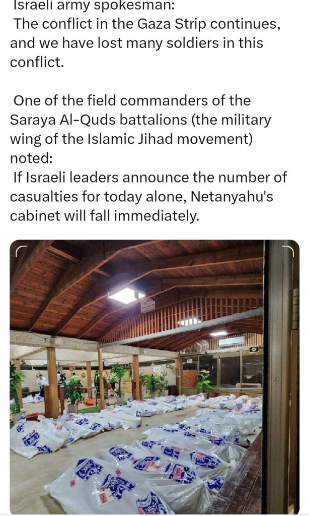 π₯ DAY 21 π₯ AL QASSAM BRIGADES HAVE CAPTURED LEADER OF AL BUREIJ CAMP ATTACK ISRAELI COLONEL YAIR SHALAM, WALLAH HEBREW WEBSITE SAYS π₯ ISRAELI ARMY TOOK A DEVASTATING BLOW, TANKS ‘BURNING LIKE TOYS AND DOLLS’ π₯ INCURSIONS TO EAST OF GAZA MET STIFF RESISTANCE π₯ GAZA WAS POUNDED WITH STRIKES CLOSE TO SHIFA, INDONESIAN HOSPITALS π₯ TROOPS – INCLUDING US DELTA FORCES – HAVE WITHDRAWN π₯ UN GENERAL ASSEMBLY VOTES FOR IMMEDIATE CEASEFIRE π₯