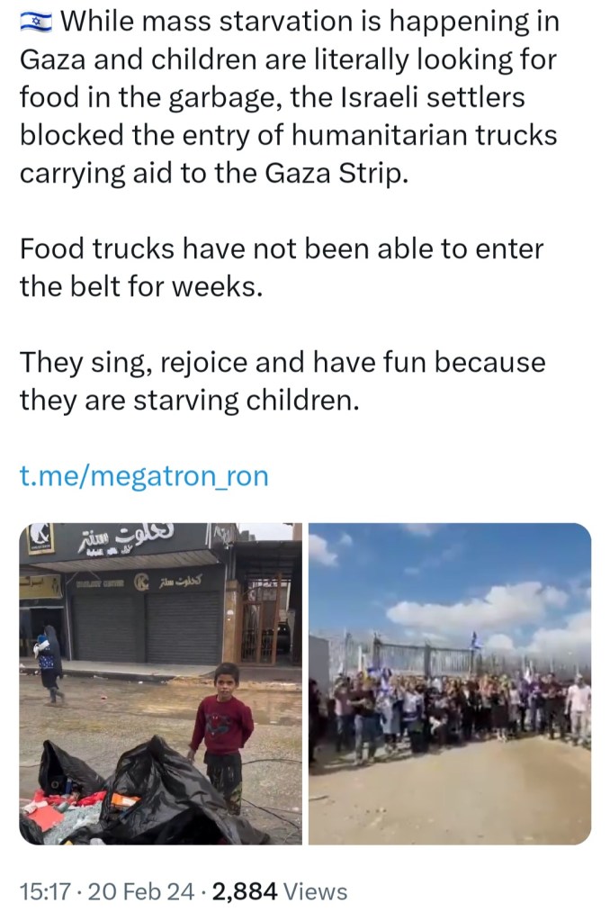 Image π₯ DAY 137 π₯ ISRAELIS BLOCK AID TRUCKS FROM REACHING NORTHERN GAZA, WHERE HUNGRY PALESTINIAN CHILDREN SEARCH FOR FOOD IN GARBAGE π¦ π§ π¨βπ§ π¨βπ©βπ§βπ¦ π΅πΈ βοΈ π΅πΈ 20 Tuesday Feb 2024 Posted by The Template News, Current Affairs and Sport Website in Arab World π, Children, International News, Politics πΌ π³ πͺ, UK, USA πΊπΈ, Women ≈ Leave a comment Tagsπ΅πΈ, π¦, π§, πΆ, Gaza, Genocide, Palestine Share this: Click to share on Facebook (Opens in new window) Facebook Click to share on LinkedIn (Opens in new window) LinkedIn Click to share on X (Opens in new window) X Click to share on Tumblr (Opens in new window) Tumblr Like Loading... Related