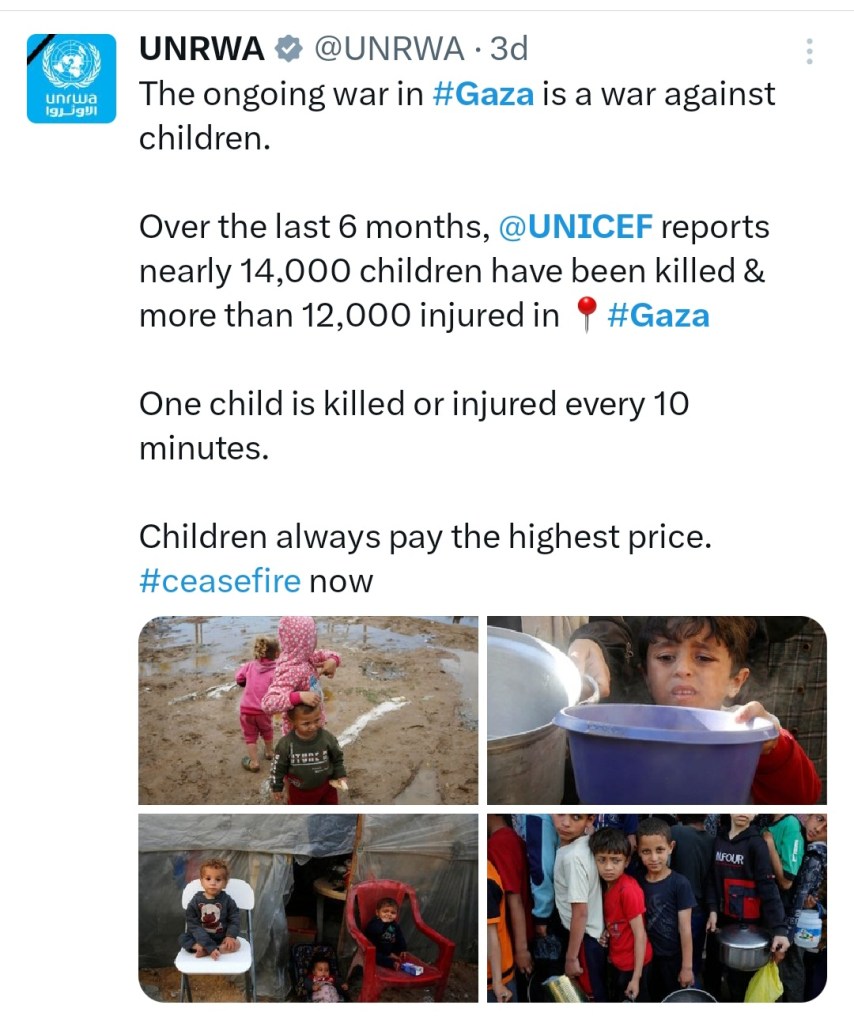 Image π₯ DAY 198 π₯ UNICEF CALLS FOR END TO THE KILLING OF CHILDREN AND AN IMMEDIATE CEASEFIRE IN GAZA π΅πΈ βοΈ π΅πΈ 21 Sunday Apr 2024 Posted by The Template News, Current Affairs and Sport Website in Arab World π, Children, International News, Politics πΌ π³ πͺ, Terrorism, UK, USA πΊπΈ ≈ Leave a comment TagsChildren, π΅πΈ, Gaza, Genocide, Palestine, UNICEF Share this: Click to share on Facebook (Opens in new window) Facebook Click to share on LinkedIn (Opens in new window) LinkedIn Click to share on X (Opens in new window) X Click to share on Tumblr (Opens in new window) Tumblr Like Loading... Related