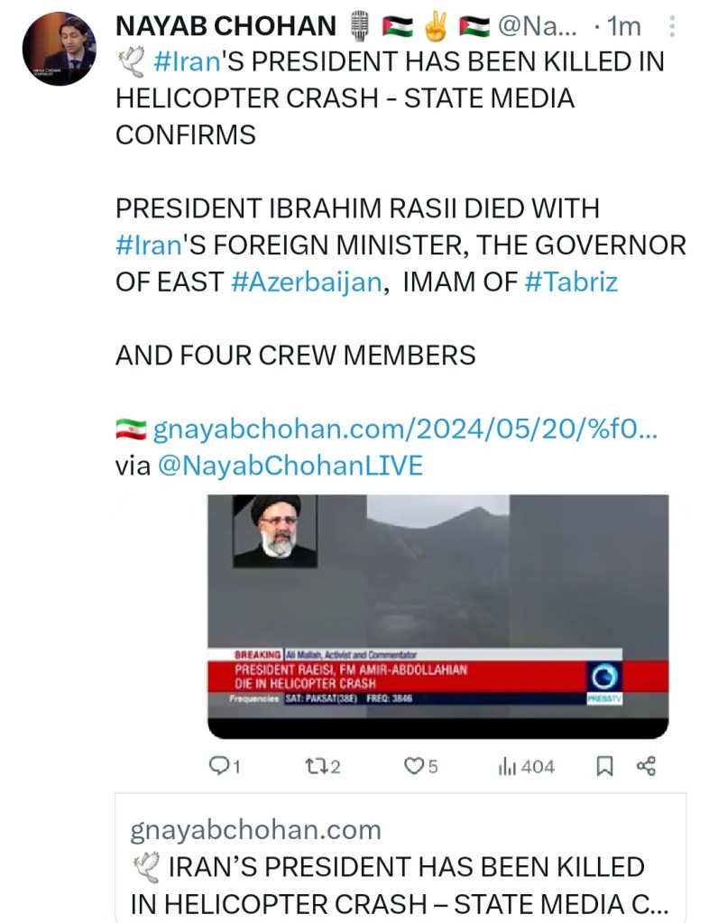 Image ๐ IRAN’S PRESIDENT IBRAHIM RAEISI HAS BEEN KILLED IN A HELICOPTER CRASH ๐ฎ๐ท 20 Monday May 2024 Posted by The Template News, Current Affairs and Sport Website in Arab World ๐, Breaking News ๐บ ๐๐, International News ≈ Leave a comment Tags๐ฎ๐ท, ๐ต๐ธ, Gaza, Genocide, Iran, Palestine Share this: Click to share on Facebook (Opens in new window) Facebook Click to share on LinkedIn (Opens in new window) LinkedIn Click to share on X (Opens in new window) X Click to share on Tumblr (Opens in new window) Tumblr Like Loading... Related