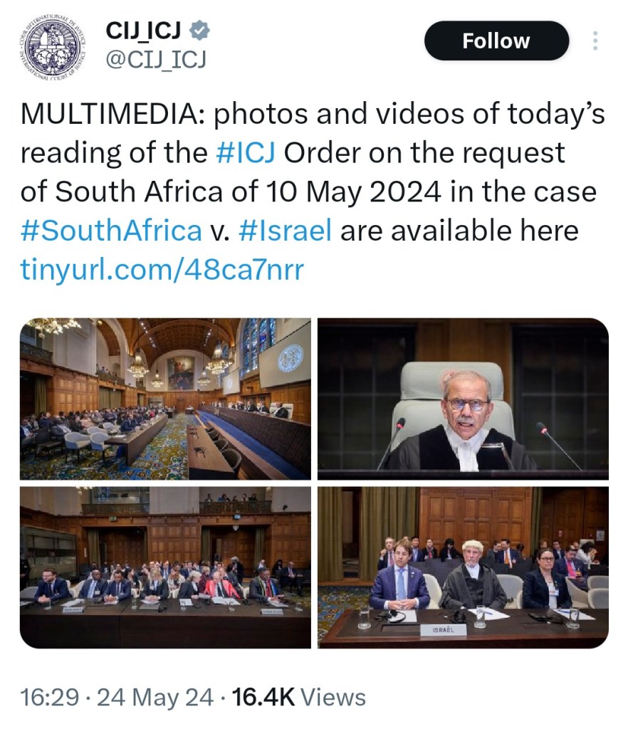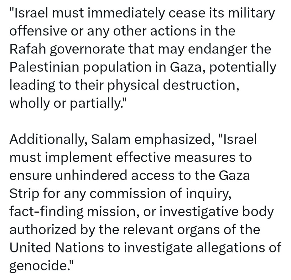 Image π₯ DAY 231 π₯ WORLD COURT ORDERS ISRAEL TO STOP RAFAH OFFENSIVE, BUT TEL AVIV INTENSIFIES BOMBARDMENT π΅πΈ βοΈ π΅πΈΒ 24 Friday May 2024 Posted by The Template News, Current Affairs and Sport Website in Arab World π, International News, Politics πΌ π³ πͺ, UK, USA πΊπΈ ≈ Leave a comment TagsβοΈ, π΅πΈ, π₯, Gaza, Genocide, ICJ, International Court of Justice, Palestine, Rafah Share this: Click to share on Facebook (Opens in new window) Facebook Click to share on LinkedIn (Opens in new window) LinkedIn Click to share on X (Opens in new window) X Click to share on Tumblr (Opens in new window) Tumblr Like Loading... Related