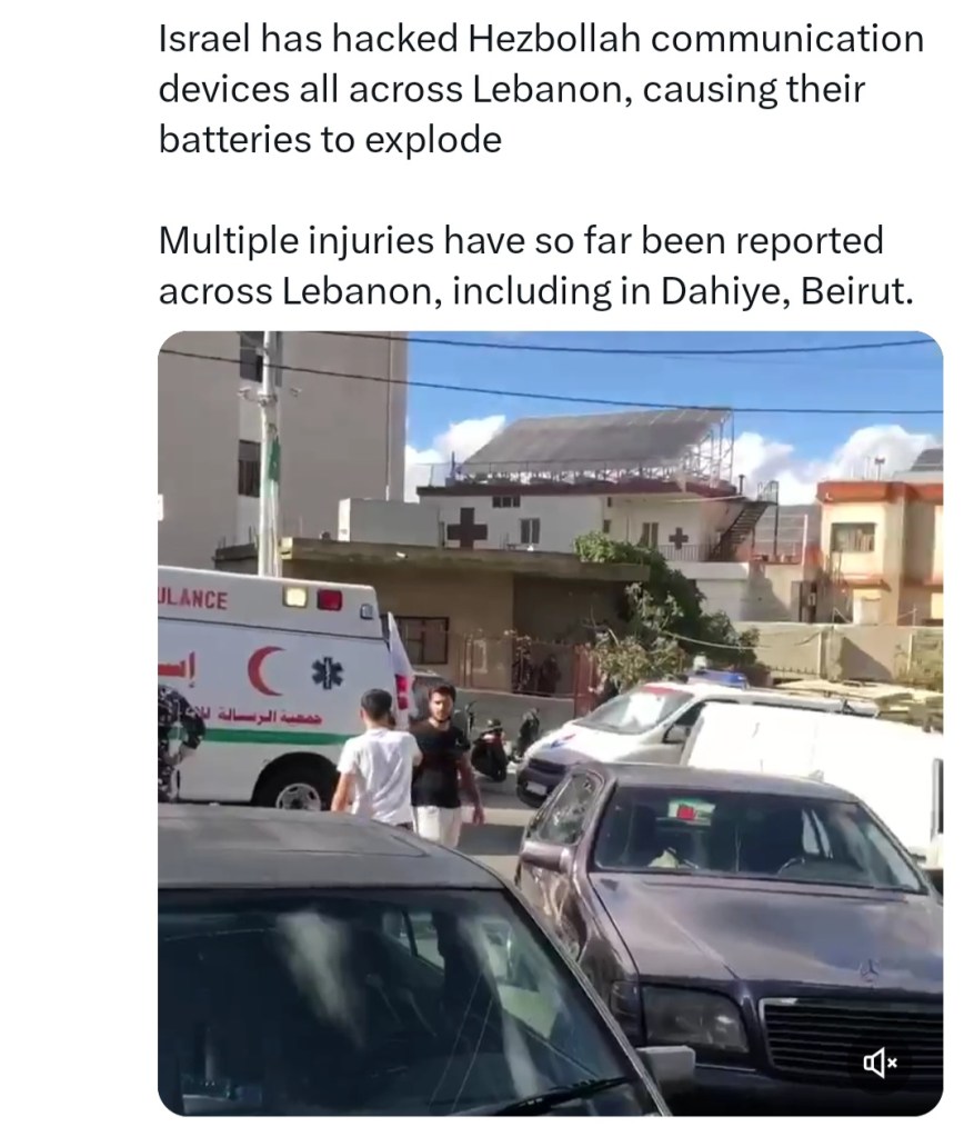 Image ๐ฅ DAY 347 ๐ฅ HUNDREDS INJURED AFTER ISRAELI CYBERATTACK TARGETEDย PAGERS IN LEBANON ๐ฑ๐ง โ๏ธ ๐ต๐ธย 17 Tuesday Sep 2024 Posted by The Template News, Current Affairs and Sport Website in Arab World ๐, Crime ๐ช ๐ซ, International News, Politics ๐ผ ๐ณ ๐ช, UK, USA ๐บ๐ธ ≈ Leave a comment Tags๐ฑ๐ง, ๐ต๐ธ, ๐ฅ, Gaza, Genocide, Hezb-Allah, Hezbollah, LEBANON, Palestine Share this: Click to share on Facebook (Opens in new window) Facebook Click to share on LinkedIn (Opens in new window) LinkedIn Click to share on X (Opens in new window) X Click to share on Tumblr (Opens in new window) Tumblr Like Loading... Related