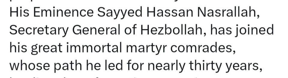 Image π₯ DAY 358 π₯ HEZB-ALLAH LEADER HASSAN NASRALLAH WAS KILLED DURING ISRAEL’S MASSIVE BOMBARDMENT OF BEIRUT YESTERDAY π±π§ βοΈ π΅πΈ 28 Saturday Sep 2024 Posted by The Template News, Current Affairs and Sport Website in Arab World π, Crime πͺ π«, International News, Politics πΌ π³ πͺ, Terrorism, UK, USA πΊπΈ ≈ Leave a comment Tagsπ±π§, π΅πΈ, π₯, Gaza, Genocide, Hamas, Hassan Nasrallah, Hezb-Allah, Hezbollah, LEBANON, Palestine HEZB-ALLAH STATEMENT Share this: Share on Facebook (Opens in new window) Facebook Share on LinkedIn (Opens in new window) LinkedIn Share on X (Opens in new window) X Share on Tumblr (Opens in new window) Tumblr Like Loading... Related