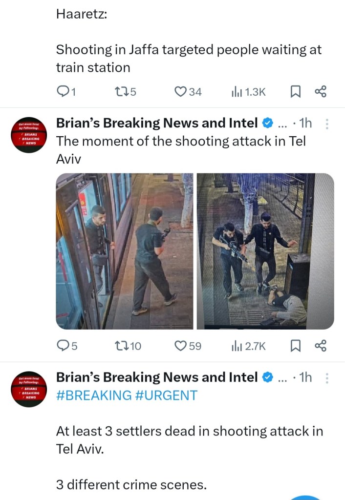 Image ๐ฅ DAY 361 ๐ฅ IRAN POUNDED ISRAEL WITH HUNDREDS OF MISSILES WHILST TWO GUNMEN ATTACKED A TRAIN OF PASSENGERS IN TEL AVIV ๐ฎ๐ท โ๏ธ ๐ต๐ธย 01 Tuesday Oct 2024 Posted by The Template News, Current Affairs and Sport Website in Arab World ๐, Crime ๐ช ๐ซ, International News, Politics ๐ผ ๐ณ ๐ช, Terrorism, UK, USA ๐บ๐ธ ≈ Leave a comment Tagsโ๏ธ, ๐ฎ๐ท, ๐ฑ๐ง, ๐ต๐ธ, Gaza, Genocide, Hezb-Allah, Iran, LEBANON, Palestine Share this: Click to share on Facebook (Opens in new window) Facebook Click to share on LinkedIn (Opens in new window) LinkedIn Click to share on X (Opens in new window) X Click to share on Tumblr (Opens in new window) Tumblr Like Loading... Related