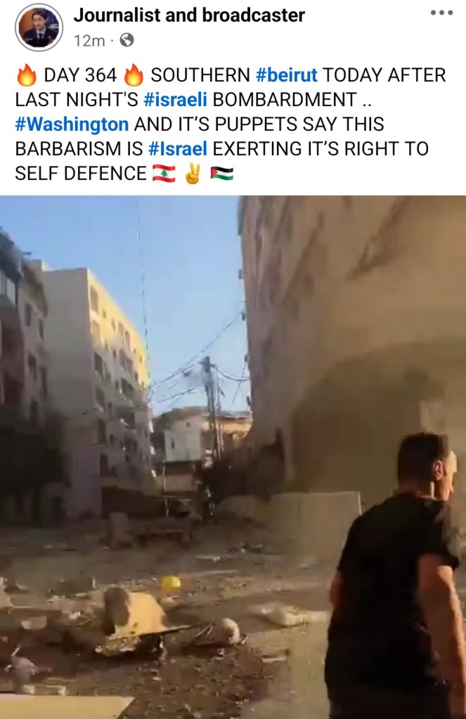 Image π₯ DAY 364 π₯ SOUTHERN BEIRUT THIS MORNING AFTER INTENSE ISRAELI BOMBARDMENT AT DAHIYA π±π§ βοΈ π΅πΈ 04 Friday Oct 2024 Posted by The Template News, Current Affairs and Sport Website in Arab World π, Crime πͺ π«, International News, Politics πΌ π³ πͺ, Terrorism, USA πΊπΈ ≈ Leave a comment TagsβοΈ, Beirut, Dahiya, π±π§, π΅πΈ, π₯, Gaza, Genocide, Hezb-Allah, LEBANON, Palestine Share this: Click to share on Facebook (Opens in new window) Facebook Click to share on LinkedIn (Opens in new window) LinkedIn Click to share on X (Opens in new window) X Click to share on Tumblr (Opens in new window) Tumblr Like Loading... Related