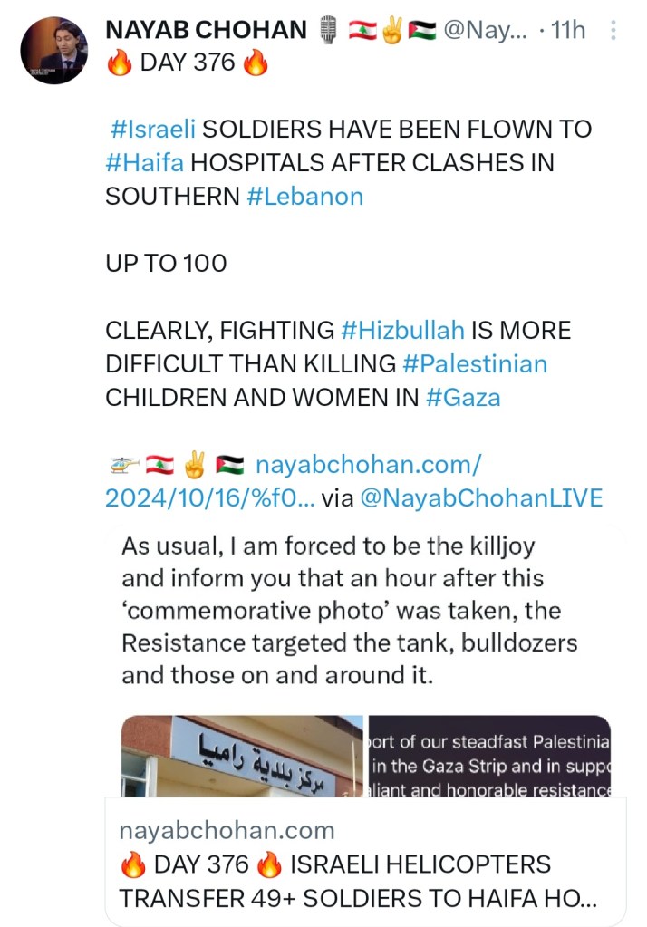 Image π₯ DAY 376 π₯ ISRAELI HELICOPTERS TRANSFER 49+ SOLDIERS TO HAIFA HOSPITALS AFTER A FAILED INCURSION INTO LEBANESE TOWN π π±π§ βοΈ π΅πΈΒ 16 Wednesday Oct 2024 Posted by The Template News, Current Affairs and Sport Website in Arab World π, Crime πͺ π«, International News, Politics πΌ π³ πͺ, UK, USA πΊπΈ ≈ Leave a comment TagsβοΈ, π±π§, π΅πΈ, π, Gaza, Genocide, Hezb-Allah, Hezbollah, LEBANON, Palestine Share this: Click to share on Facebook (Opens in new window) Facebook Click to share on LinkedIn (Opens in new window) LinkedIn Click to share on X (Opens in new window) X Click to share on Tumblr (Opens in new window) Tumblr Like Loading... Related