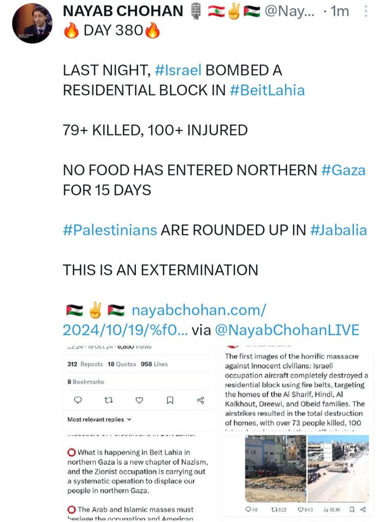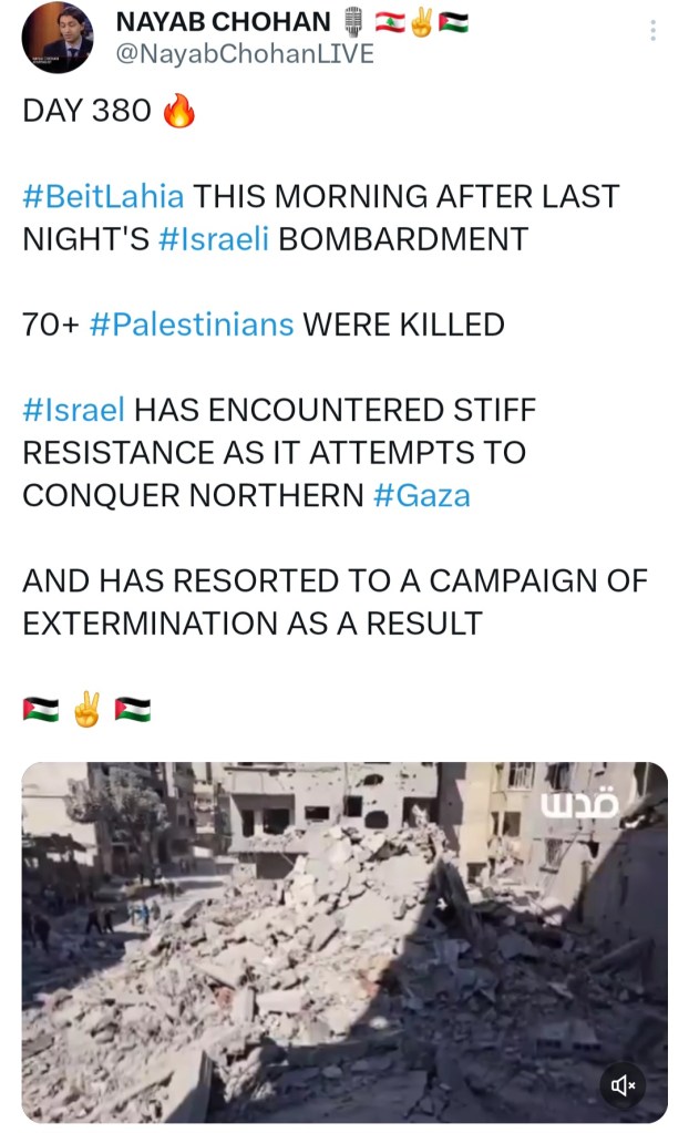 Image π₯ DAY 379 π₯ ISRAEL HAS BOMBED A RESIDENTIAL BLOCK IN BEIT LAHIA, NORTHERN GAZA π΅πΈ βοΈ π΅πΈ 19 Saturday Oct 2024 Posted by The Template News, Current Affairs and Sport Website in Arab World π, Crime πͺ π«, International News, Politics πΌ π³ πͺ, Terrorism, UK, USA πΊπΈ ≈ Leave a comment TagsβοΈ, Beit Lahia, π΅πΈ, π₯, Gaza, Genocide, Holocaust, Massacre, Palestine Share this: Click to share on Facebook (Opens in new window) Facebook Click to share on LinkedIn (Opens in new window) LinkedIn Click to share on X (Opens in new window) X Click to share on Tumblr (Opens in new window) Tumblr Like Loading... Related