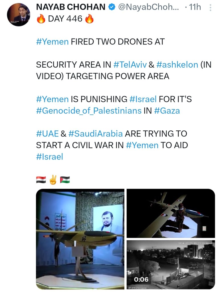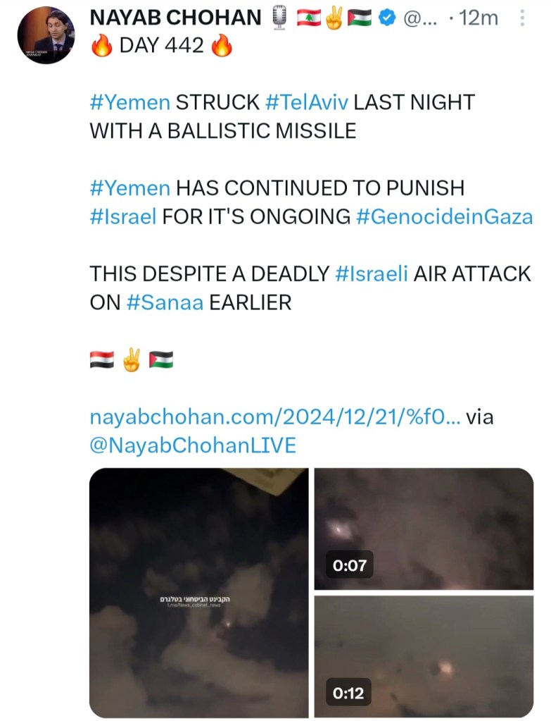 ON CHRISTMAS DAY, YEMEN TARGERTED MILITARY INSTALLATIONS IN TEL AVIV AND ASHKELON, AS ISRAEL CONTINUES TO MASSACRE PALESTINIANS IN GAZA AND WEST BANK