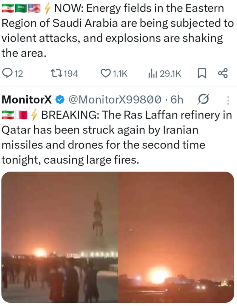 Image IRAN HAS STRUCK QATAR & SAUDI ARABIAN ENERGY FIELDS AFTER US-ISRAELI ATTACK ON IT’S STRATEGIC GAS GRID 19 Thursday Mar 2026 Posted by The Template News, Current Affairs and Sport Website in Arab World π, Crime πͺ π«, International News, Politics πΌ π³ πͺ, Terrorism, UK, USA πΊπΈ ≈ Leave a comment TagsGas, Iran, Oil, South Pars, War Share this: Share on Facebook (Opens in new window) Facebook Share on LinkedIn (Opens in new window) LinkedIn Share on X (Opens in new window) X Share on Tumblr (Opens in new window) Tumblr Like Loading... Related
