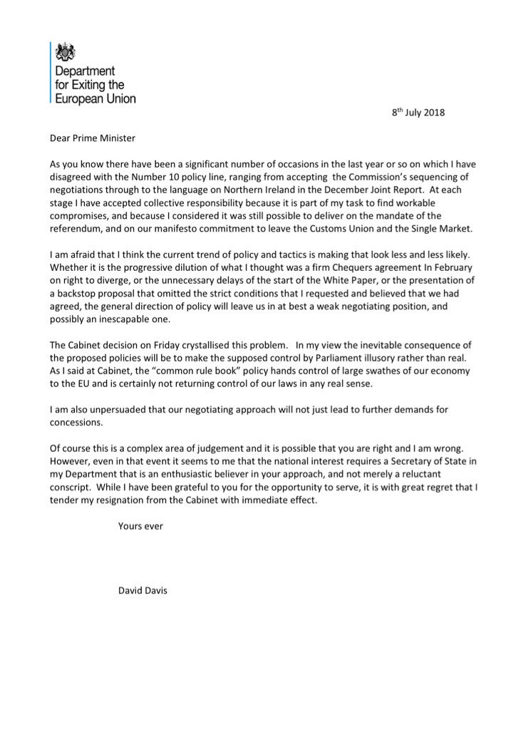 DAVID DAVIS BREXIT SECRETARY EXPLAINED WHY HE HAD LEFT HIS POSITION IN THIS LETTER ..